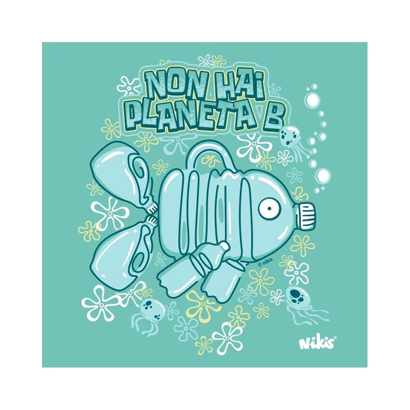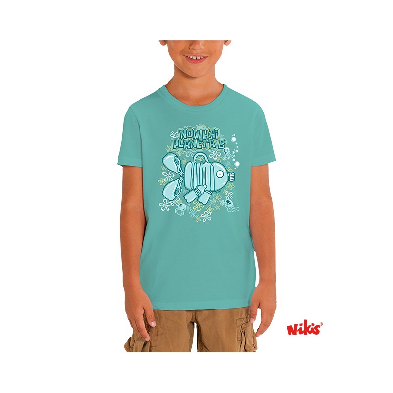 Diseño: Un pez formado por botellas de plástico y la frase "Non hai planeta B". Material: 100% algodón. Gramaje: 190 g/m², resistente para aguantar todas sus aventuras. Corte: Tubular, sin costuras laterales para mayor comodidad. Cuello: Redondo con cubrecosturas reforzado. Tallas: Disponibles para niños y niñas.