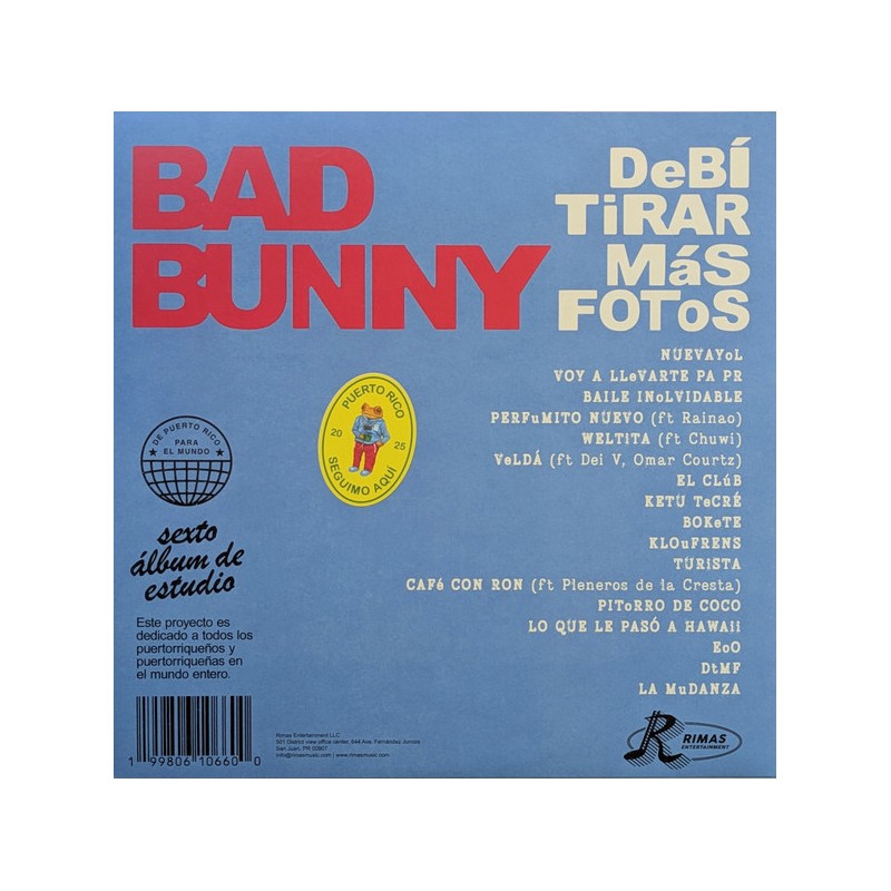 Side A : Nuevayol 3:04 / Voy A Llevarte Pa PR 2:36 / Baile Inolvidable 6:08 / Perfumito Nuevo (Featuring – RaiNao) 3:21 Side B : Weltita (Featuring – Chuwi) 3:08 / Veldá (Featuring – Dei V, Omar Courtz) 3:55 / El Clúb 3:43 / Ketu Tecré 4:11 / Bokete 3:36 Side C : Kloufrens 3:19 / Turista 3:10 / Café Con Ron (Featuring – Pleneros De La Cresta*) 3:49 / Pitorro De Coco 3:27 Side D : Lo Que Lo Pasó A Hawaii 3:49 / Eoo 3:25 / DTMF 3:57 / La Mudanza 3:33