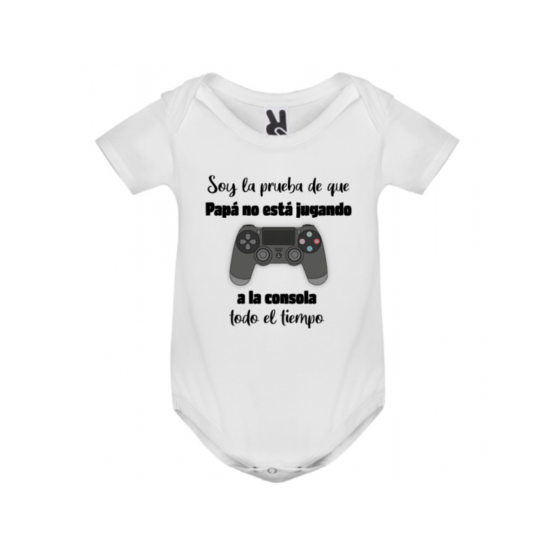 "Soy la prueba de que mi papá no está jugando a la consola todo el tiempo" Body de bebé con manga corta de punto liso. Cuello redondo y bajo ribeteado en canalé 1x1. Cierre con botones a presión en la entrepierna. Hombro de apertura cruzada. Composición: 96% algodón peinado / 4% elastano , 175 g/m²