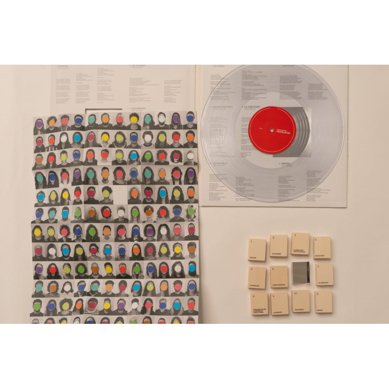 Producción artesanal de una caja exclusiva en metacrilato translúcido hielo mate que contiene once piezas de madera serigrafiadas con las portadas de las canciones y una pieza espejo. Además de un póster desplegable de 12 cuerpos, las letras de las canciones y cd
