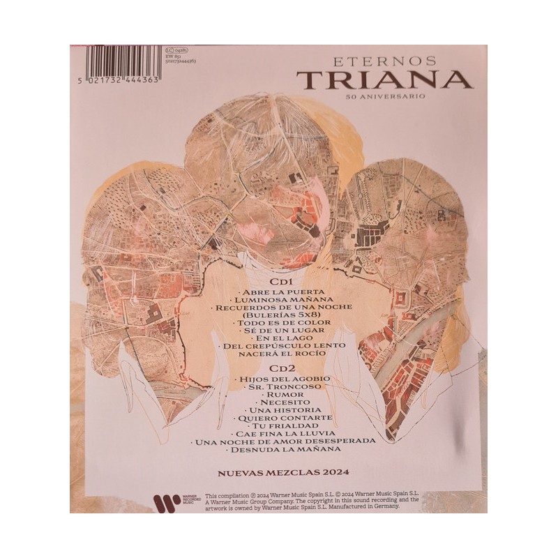 Este año 2024 se cumple el 50 aniversario de la formación de Triana y para celebrar dicha efeméride se anuncia la publicación el 8 de noviembre de un disco recopilatorio que incluye nuevas mezclas de todos sus clásicos. Estas mezclas han actualizado su sonido manteniendo la esencia original y consiguiendo que cinco décadas después suene de plena actualidad. "Eternos Triana" contiene 17 canciones indispensables de un grupo que hizo historia en la música española y cuyo legado sigue estando más vivo que nunca, traspasando generaciones y llegando a una nueva hornada de artistas que reivindican apasionadamente el sonido del grupo sevillano. No ha habido ningún grupo o artista que haya definido mejor que Triana el concepto de "rock andaluz". Una sonoridad, un repertorio y una estética que bebía del rock progresivo anglo (Pink Floyd, King Crimson, Yes) para mezclarlo con una cultura flamenca milenaria enraizada en el ADN de los tres miembros del grupo (Jesús de la Rosa, Eduardo Rodríguez Rodway y Juan Jose Palacios). "Eternos Triana" es un merecido homenaje al lugar que el grupo sevillano ocupa en la historia de la cultura española y se publicará el 8 de noviembre en varias ediciones, entre ellas en este doble CD.