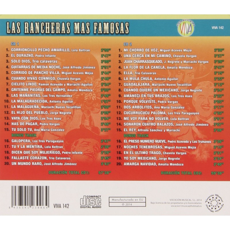 Cd 1: Orrioncillo Pecho Amarillo ( Lola Beltran) - El Durazno (Pedro Infante) - Solo Dios (Trío Calaveras) - Guitarras De Media Noche (José Alfredo Jiménez) - Corrido De Pancho Villa (Miguel Aceves Mejía) - Cuando Vivas Conmigo (Chavela Vargas) - Cielito Lindo (Ramon Acevedo Y Mariachi Aguilas) - Gritenme Piedras Del Campo (Amalia Mendoza) - Las Mañanitas (Los Tres Hernández) - La Malagradecida (Antonio Aguilar) - La Malagueña( Mariachi Nuevo Tecalitlan) - El Hijo Del Pueblo (Jorge Negrete) - Vaya Con Dios (Pedro Vargas) - Has De Pagar (Pedro Vargas) - Tu Solo Tu (Ana María González) - Galopera (Los Tres Paraguayos) - Tu Y La Mentira (Lola Beltran) - Dicen Que Soy Mujeriego (Pedro Infante) - Fallaste Corazon (Trio Calaveras) - Un Mundo Raro (José Alfredo Jiménez) Cd 2: Mi Chorro De Voz (Miguel Aceves Mejía) - Una Cerca En Mi Camino (Chavela Vargas) - Juan Charrasqueado (J. Negrete Y Mariachi Vargas) - La Flor De La Canela (Amalia Mendoza) - Ella (Trio Calaveras) - La Mula Chula (Antonio Aguilar) - Guadalajara (Mariachi Nuevo Tecalitlan) - Cuando Queire Un Mexicano (Jorge Negrete) - Amaneci En Tus Brazos (Los Tres Ases) - Porque Volviste (Pedro Vargas) - Dos Arbolitos (Ana María González)- Cucurrucucu Paloma (Los Tres Paraguayos) - Me Voy Para No Volver (Lola Beltran) - Sonaron Cuatro Balazos (Joé Alfredo Jiménez) - El Rey (Alfredo Sánchez Y Mariachi) - El Preso Numero Nueve (Pedro Acevedo Y Los Truhanes) - Noches Tenebrosas (Miguel Aceves Mejía) - En El Ultimo Trago (Chavela Vargas) - Yo Soy Mexicano (Jorge Negrete) - Amarga Navidad (Amaia Mendoza